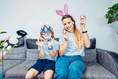 Portraits of happy smiling Caucasian mother and her son in bunny ears having fun with easter eggs at home on Easter day. Family sitting on sofa at home. Family Easter traditions. Selective focus.