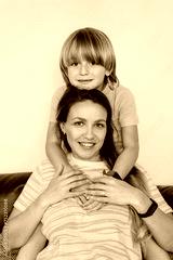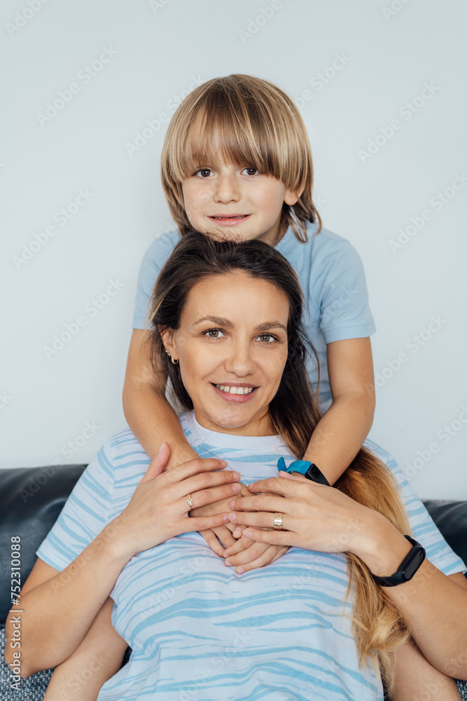Portrait of happy smiling family at home. Son and mother sitting on the sofa and looking at camera, hugging each other during home family weekend. Selective focus.