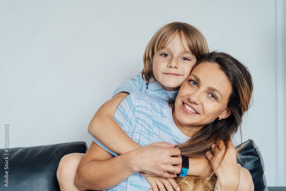 Portrait of happy smiling family at home. Son and mother sitting on the sofa and looking at camera, hugging each other during home family weekend. Selective focus