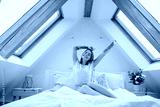 Young woman sits on the bed, arms outstretched in comfort, smiling