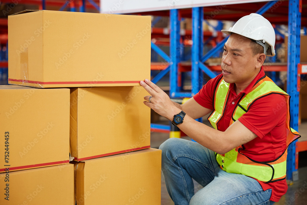 factory worker or warehouser checking corrugated boxes in the warehouse storage