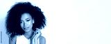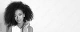 Beautiful woman in t-shirt on creamy background.