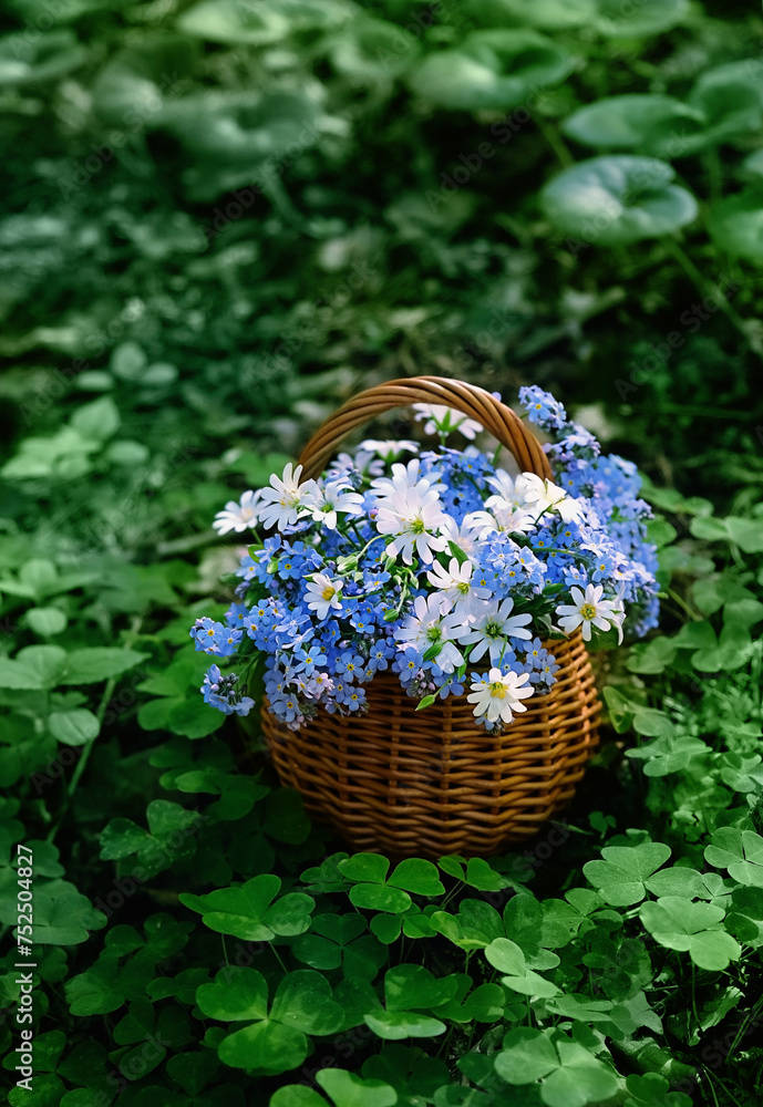 wicker basket with blue and white flowers in forest, green natural background. spring, summer season. floral composition with Stellaria, forget-me-not flowers. template for design
