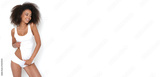 Happy african american woman in white t-shirt and panties shows her fit body.