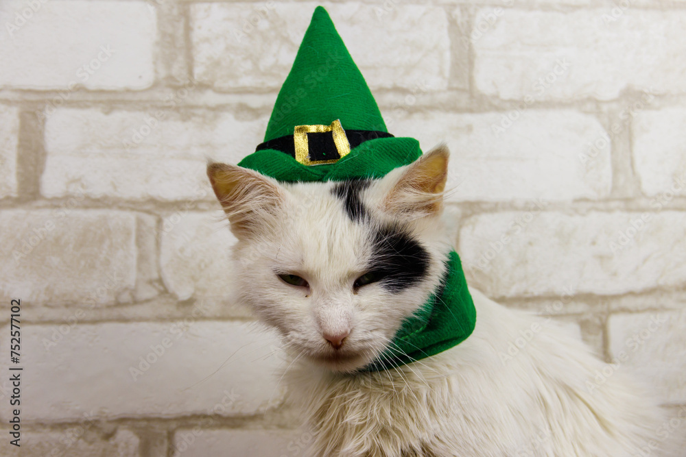 Portrait of beautiful cat wearing a green leprechaun hat. St. Patrick's Day concept