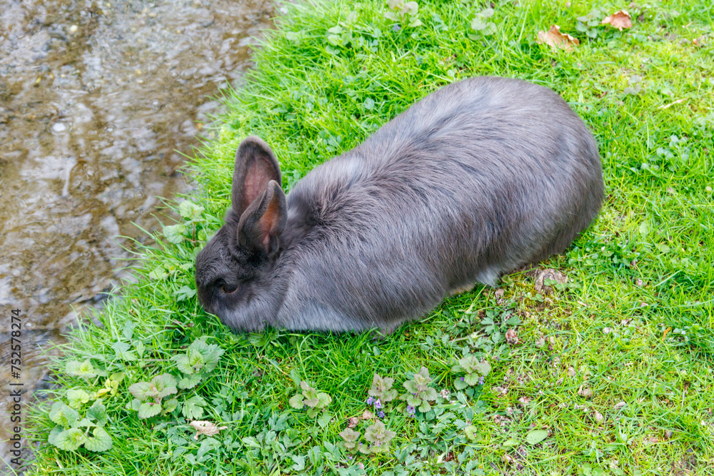 Beautiful rabbit sitting in green grass on a lawn