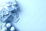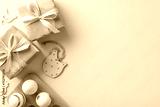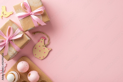 Easter happiness motif. Top view of multicolored eggs in a timber crate, charming wooden chick figures, and kraft-wrapped presents with ribbons on a gentle pink surface, space for message