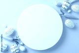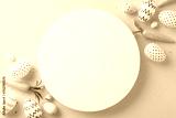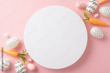 Easter project theme: Top view showcasing simple dyed eggs, sprinkles and orange carrots for the Easter Hare on a pale pink backdrop, with a vacant circular area for text