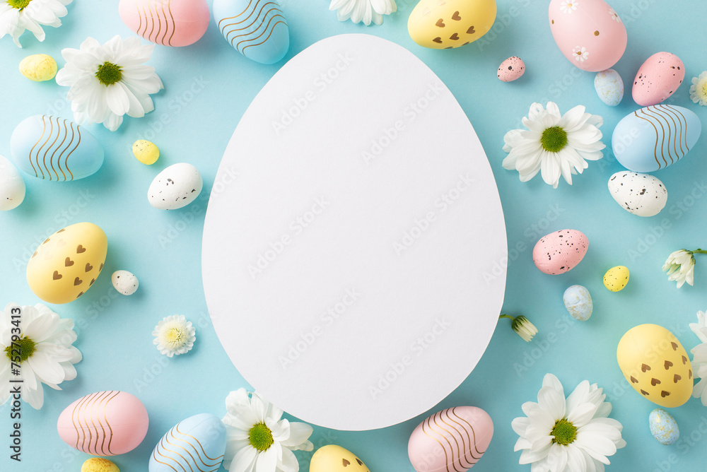 Easter setting idea: Overhead view of various eggs, and chamomile shoots on a tranquil blue surface, with an open egg-shaped outline for messages or advertising