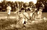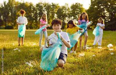 Children volunteers collect garbage to make the area a nice place at a social charity ecology event Happy little school kids clean park ground from human waste that people throw not reaching trash bin