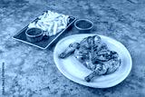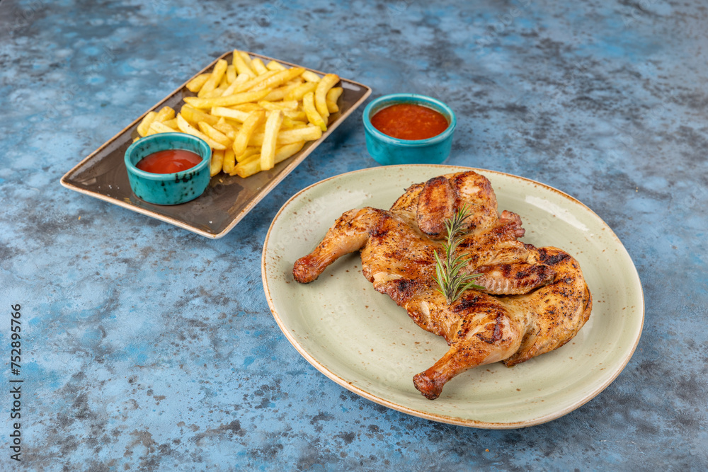 Grilled fried roast Chicken Tabaka, french fries and ketchup on plates on blue background.