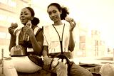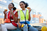 young female African factory workers or engineers having lunch and eating bread together in container warehouse storage