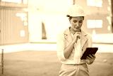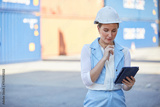 businesswoman wearing safety helmet and working on tablet in containers warehouse storage