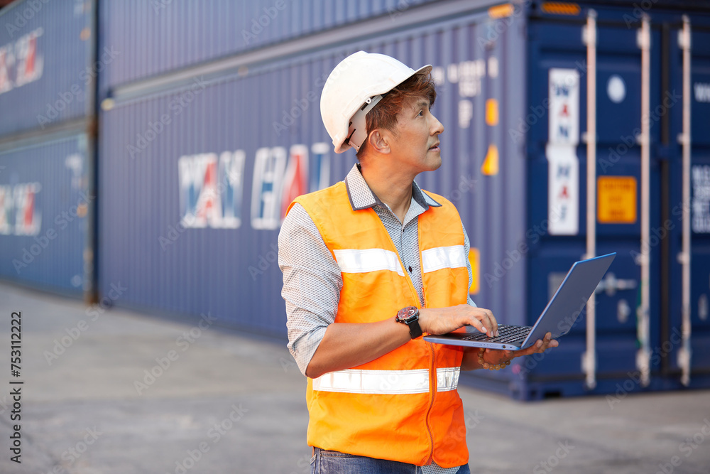 factory worker or engineer working on laptop computer in containers warehouse storage