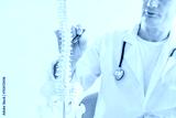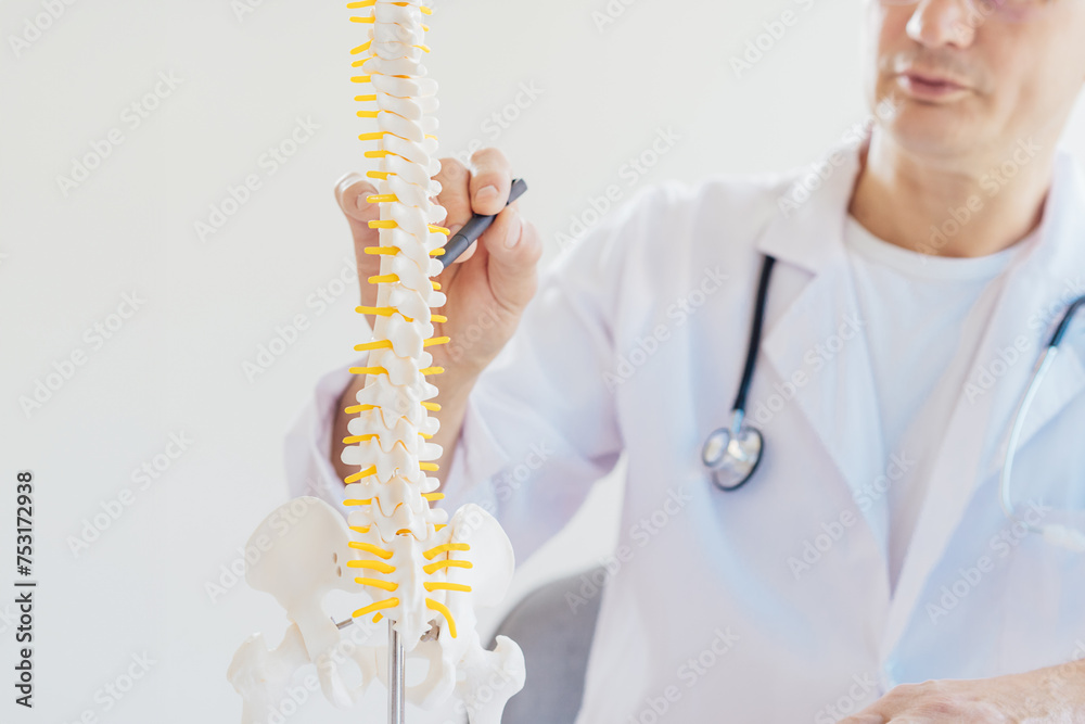 Closeup no face medical male doctor pointing on human spine model with a pen sitting in his office. Spinal healthcare and back pain treatment concept. Selective focus, copy space