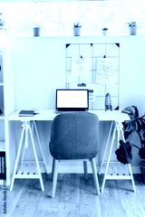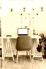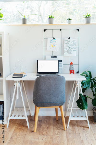 Modern cozy light workplace - white desk with laptop mockup empty screen, grid mood board with pinned notes, shelves with docs and green monstera plant at work space in home office room interior