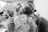Happy mother's day. Child boy hugging and kissing his mother after he congratulates mom and gives her flowers bouquet and handmade postcard. Family holiday and togetherness. Selective focus on card.