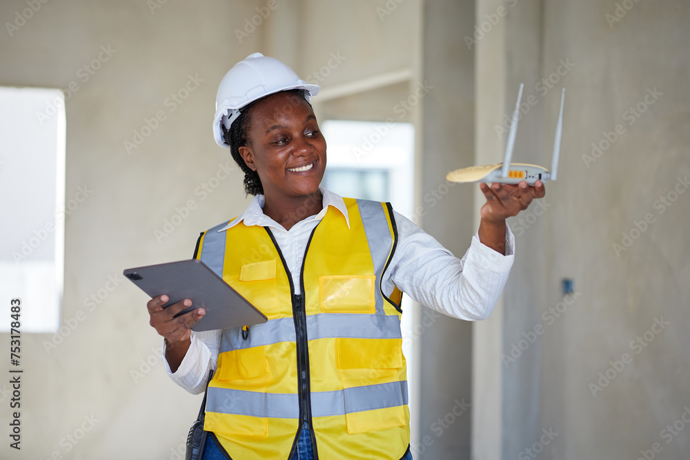 worker or technician holding and checking wifi router for install cable internet at construction site