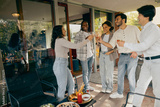 Happy young friends drinking wine and enjoying time together at holiday dinner party at home