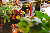 Cozy holiday table setting with different delicious food and beverages ready for friends home party