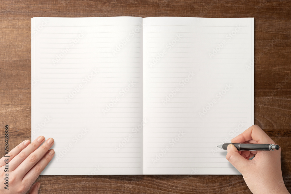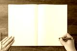卓上に広げられたノートに文字を書いている手の背景テクスチャー