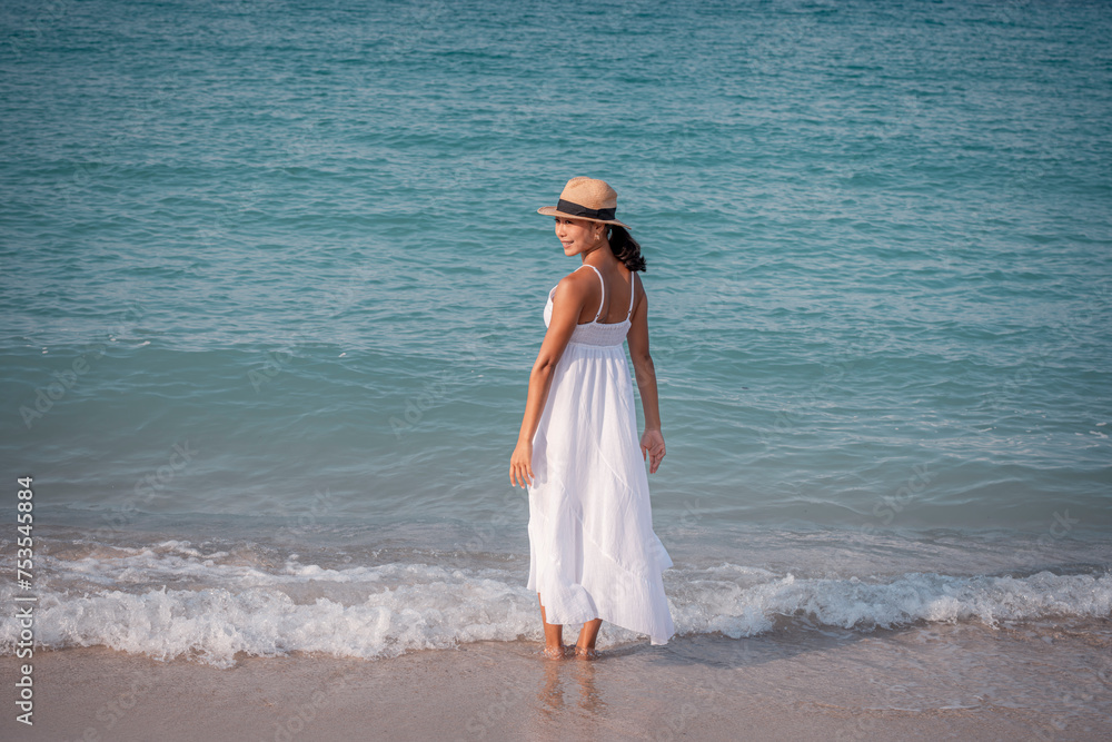 Happy sexy Asian traveller woman wear white beach dress and hat show enjoys on tropical beach vacation in summer holidays