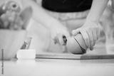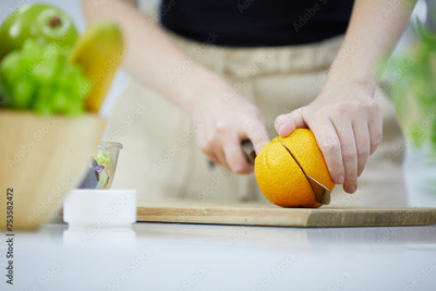 close up young woman hands cutting orange and cooking salad in the kitchen