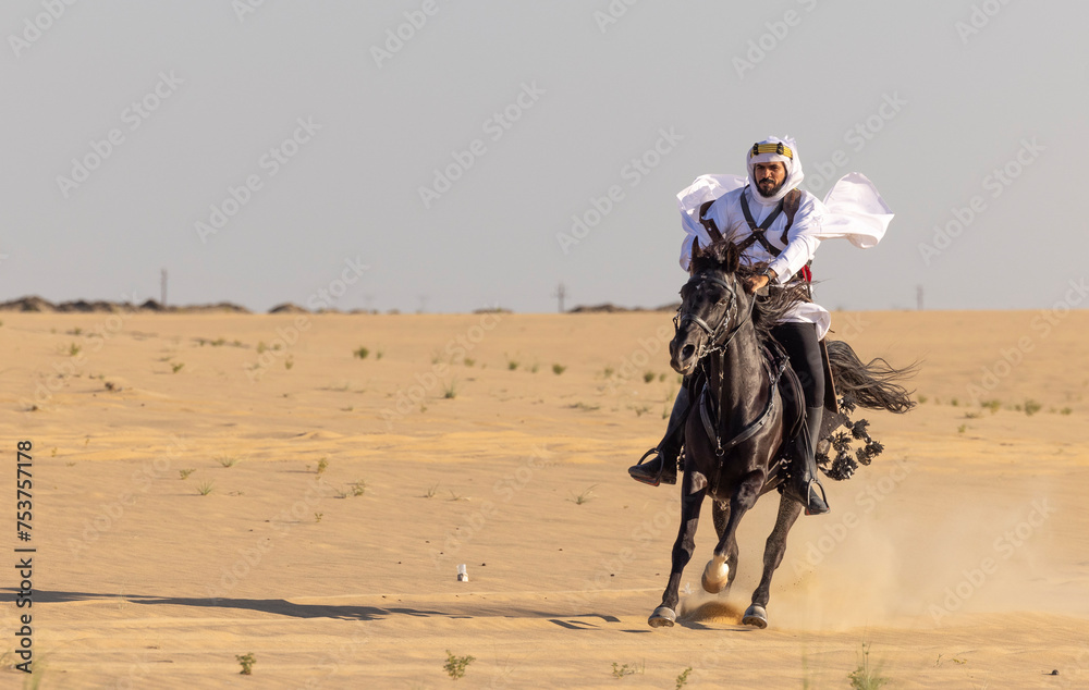 Rider in the desert of Saudi Arabia with his back stallion