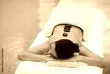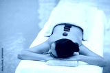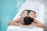 Relax, hot stone massage and woman at pool at spa for health, zen wellness and luxury holistic treatment. Self care, peace and girl on table for body therapy, comfort and calm pamper service at hotel