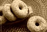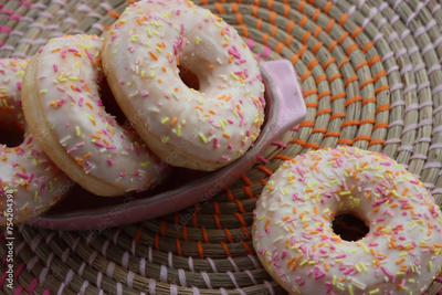 Many donuts with white glaze and yellow, orange and pink sprinkles in a pink bowl on wooden table