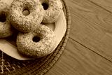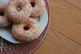 Many donuts with white glaze and yellow, orange and pink sprinkles on a white plate on wooden table