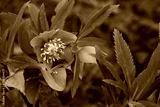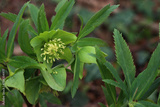 Hellebore or Christmas rose in the forest. Helleborus viridis plant in bloom with green flowers