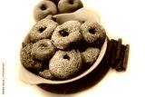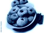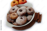 Deep fried apple rings with batter sprinkled with powdered sugar an cinnamon on white background
