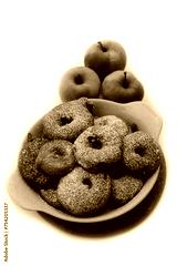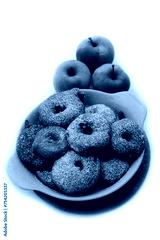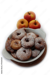 Deep fried apple rings with batter sprinkled with powdered sugar on white background