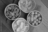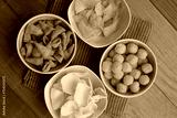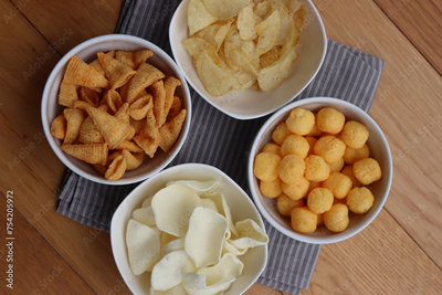 Top view of white ceramic bowls with different kind of chips on wooden table