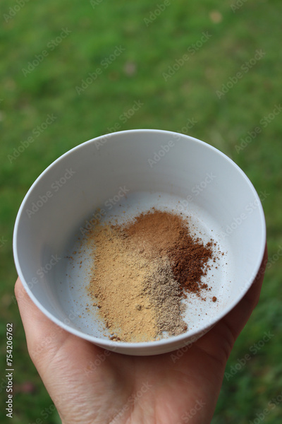 Close-up of woman hand holding plastic bowl with different spices against green background