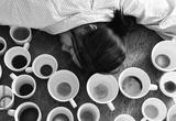 Exhausted, a tired female falls asleep at her working desk, surrounded by many empty coffee mugs, indicating a problem with caffeine addiction in female worker.