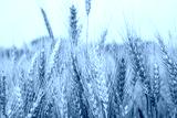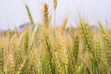 Wheat grain field closeup spike with blue sky image
