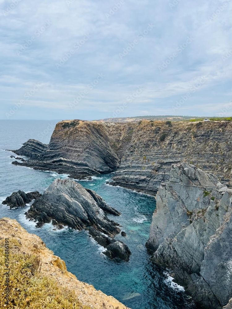 Fantastic rocky coast, cloudy sky, twilights time, ocean horizon