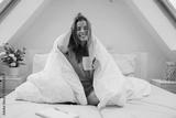 A woman with a smile sits on her bed under a blanket, holding a cup of coffee