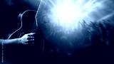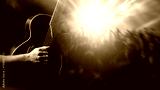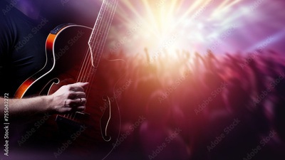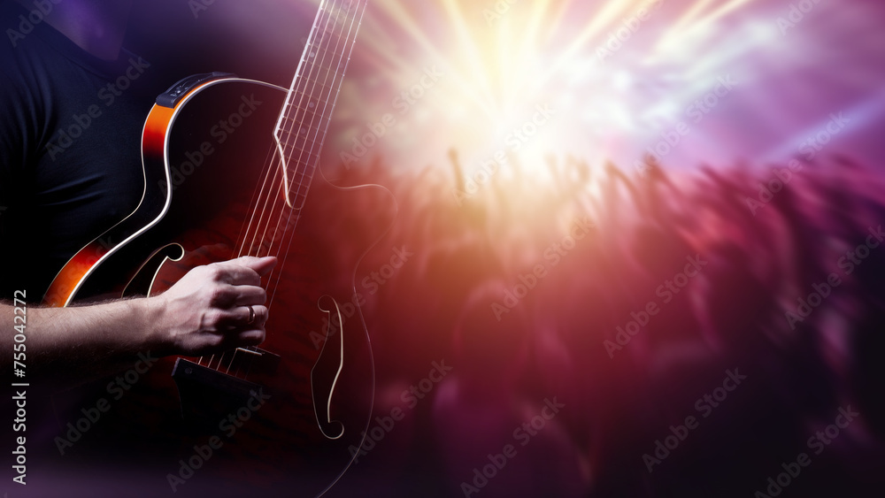Guitar in hands of man. Guitarist performs at concert. Crowd of people looks at stage. Cropped guitarist. Classical wooden guitar. Concert with live music. Rock festival. Musical show.