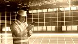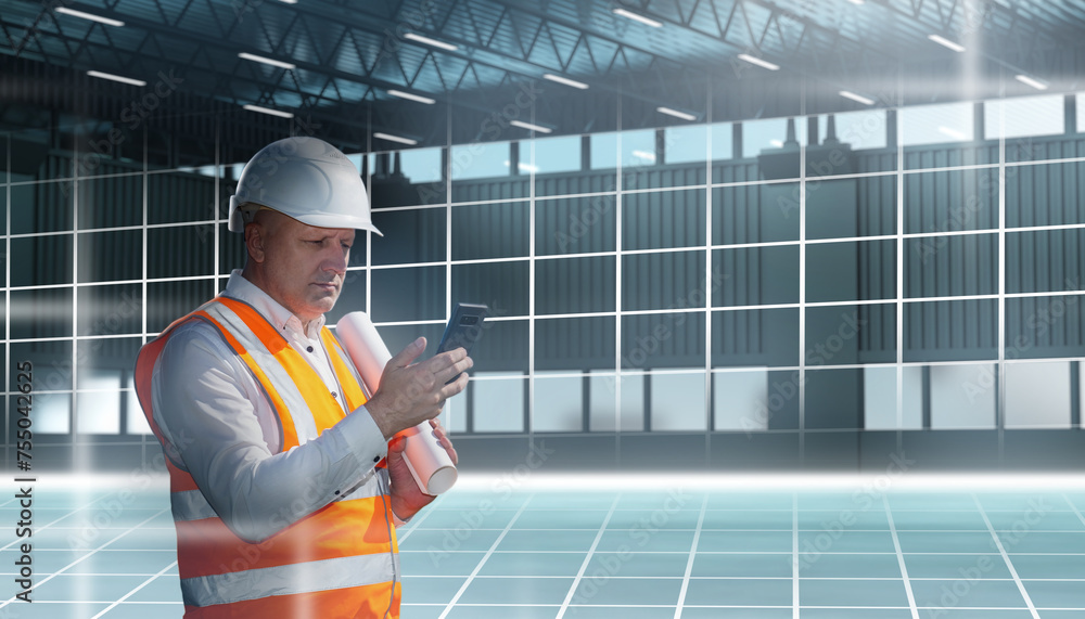Man builder of industrial buildings. Architect stands in empty hangar. Construction worker is holding mobile phone. Man engineer who designed hangar. Construction of industrial buildings.