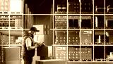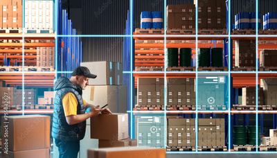 Man is standing inside warehouse. Storage with machine vision lines. Warehouse automation concept. Man works as storekeeper. Storage with high racks and boxes. Warehouse loader holding phone
