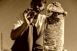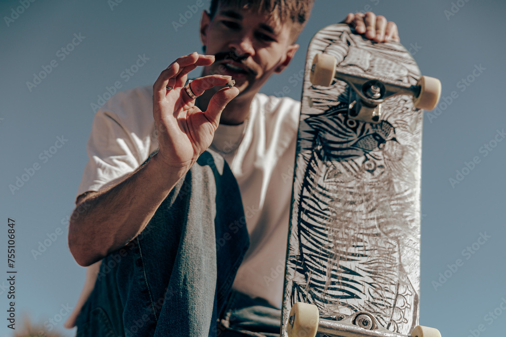 Close up of male skater looking on something while sitting with skateboard on a ramp