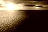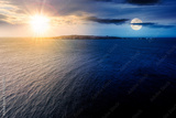 island in the sea at summer solstice. seascape with land in the distance beneath a sky with sun and moon. day and night time change concept