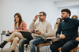 A diverse group of adult learners participate in a class discussion, exhibiting focus, engagement, and collaboration.
