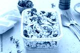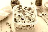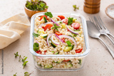 Pearl couscous salad with fresh vegetables and herbs in a meal prep container, healthy lunch or side dish