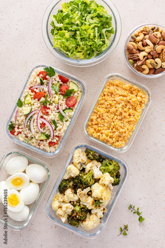 Healthy vegetarian meal prep with boiled eggs, roasted vegetables, cooked lentils, couscous salad and nuts