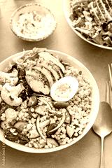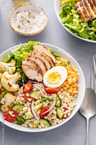 Healthy lunch bowl with grilled chicken, roasted vegetables, fresh lettuce, cooked lentils, salad and boiled egg