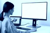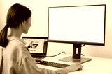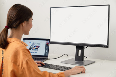 Young Asian woman typing computer keyboard with looking at the screen on the table in modern home office.